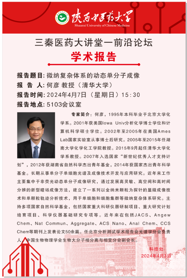“三秦医药大讲堂”——前沿论坛:微纳复杂体系的动态单分子成像
