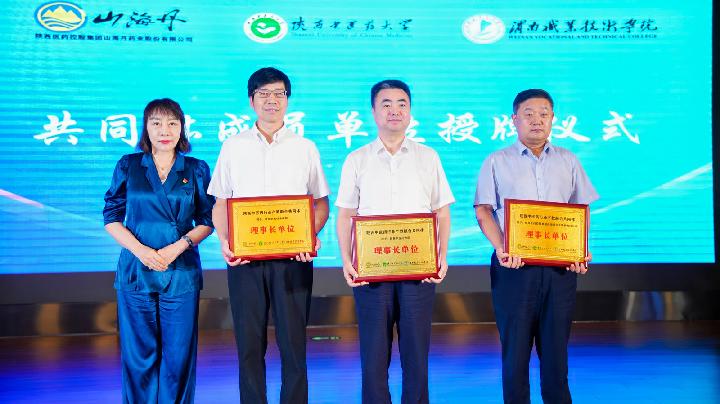 会议第二阶段,孙静主持召开陕西省中医药行业产教融合共同体成立大会。由渭南职业技术学院副院长赵永刚汇报共同体建设情况,陕药集团副总经理、山海丹药业董事长贺煜、渭南职业技术学院院长靳华锋、陕西中医药大学校长杨晓航、陕西省中华职教社秘书长王彦平、陕药集团董事长邹满绪、陕西省国资委副主任杨爱民、中共陕西省委教育工委、陕西省教育厅二级巡视员董侠分别致辞。随后,大会分别为共同体理事长单位、副理事长单位、理事单位进行授牌。