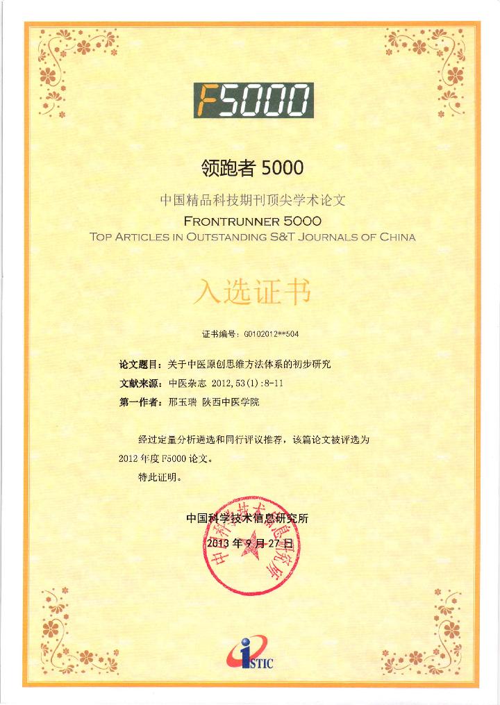 近日,中国科学技术信息研究所公布了“领跑者5000—中国精品科技期刊顶尖论文”,我校邢玉瑞教授2012年1月发表于《中医杂志》论文“关于中医原创思维方法体系的初步研究”入选2012年度F5000论文。F5000是中国科技信息研究所承担的“领跑者5000—中国精品科技期刊顶尖论文”项目。该项目于2012年10月启动,旨在扩大我国精品科技期刊的显示度,提高优秀科技论文的国际影响力。该项目入选论文的条件是进入核心期刊各学科被引次数前1%的精品期刊论文。2007-2011年,基准线以上的论文有近2万篇,遴选出引用次数超过25次以上的优秀论文和由精品期刊推荐的12年发表的论文总计约5000篇,建立了F5000科技论文平台。该平台正在探索与汤姆森路透公司合作,拟利用WOK检索平台,面向公众开放,将来与SCI数据库在同一平台内实现链接和国际引文检索,在更大的范围内向世界和科技界同行展示和推广我国最重要的科研成果。