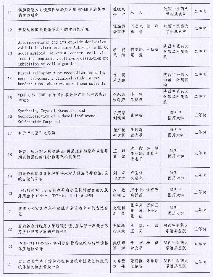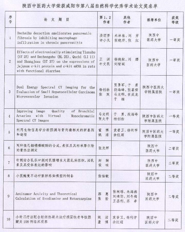 根据《咸阳市人民政府关于表彰第八届自然科学优秀学术论文暨科技建议奖的通报》(咸政函[2018]95号)收悉,我校24篇学术论文获奖,其中一等奖5篇,二等奖10篇,三等奖9篇。另外,我校及附属医院、第二附属医院被评为优秀组织单位。希望获奖论文作者再接再厉、再创佳绩,全校科技工作者以获奖者为榜样,不断进取,开拓创新,奋力追赶超越,为把我校建设成为国内一流的高水平中医药大学作出更大的贡献!