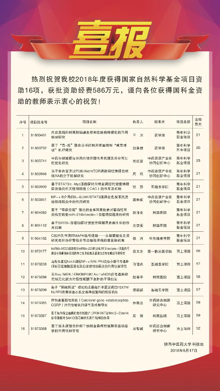 热烈祝贺我校2018年度获得国家自然科学基金项目资助16项,获批资助经费586万元,谨向各位获得国科金资助的老师表示衷心的祝贺!
