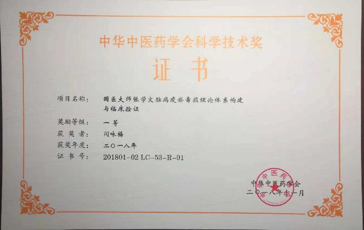 2018年11月25日,“2018年度中华中医药学会科学技术奖颁奖大会”在北京会议中心举行,国家中医药管理局、国家科学技术工作奖励办公室、中华中医药学会等部门和组织的领导、理事、中医专家和获奖代表出席大会。我校陕西省名中医,国家临床重点专科脑病科学科带头人闫咏梅教授主持的“国医大师张学文脑病痰瘀毒损理论体系构建与临床验证”项目获得中华中医药学会科学技术奖一等奖。