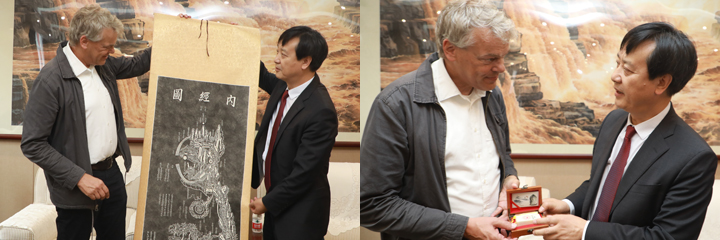 报告会后,党委书记刘力、副校长唐志书在5118会议室与莫索尔教授进行了座谈。刘力介绍了学校基本情况和近年来科研、临床工作水平,希望能与莫索尔教授及团队建立合作关系,推进中西医结合,破解疾病难题,推动临床前沿研究工作。双方就发挥顶尖人才牵头作用攻克学术难题、加强中西医结合、进一步提高人才培养质量、共建诺贝尔奖研究工作站等方面达成初步合作意向。刘力向莫索尔教授赠送了《内经图》和校友毕业生纪念品蓝田玉印章。