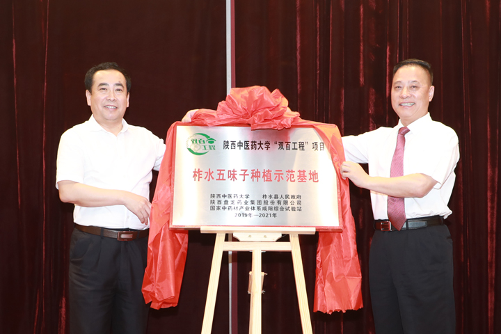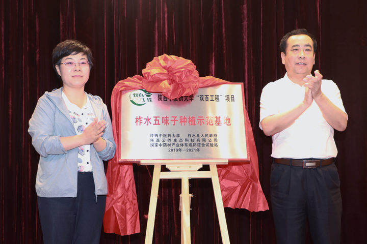 与会人员共同见证了刘力与谢晓林为“研究生培养基地”揭牌;孙振霖与谢晓林为“柞水盘龙五味子种植示范基地”揭牌;孙振霖与与张培为“柞水云岭五味子种植示范基地”揭牌;蒲济生与谢晓林进行“研究生培养基地”签约。