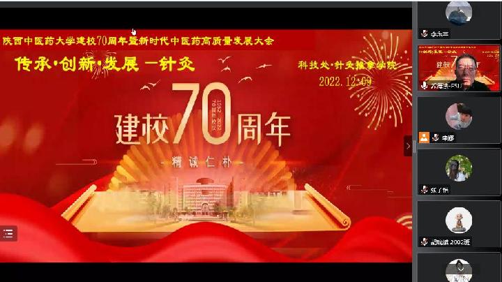 2022年12月9日,针灸推拿学院举办成功举办喜迎校庆之学术报告。会议邀请朱兵教授、乔海法教授、高昕妍教授,会议通过线上的形式举办,校内外参会人员300余人。
