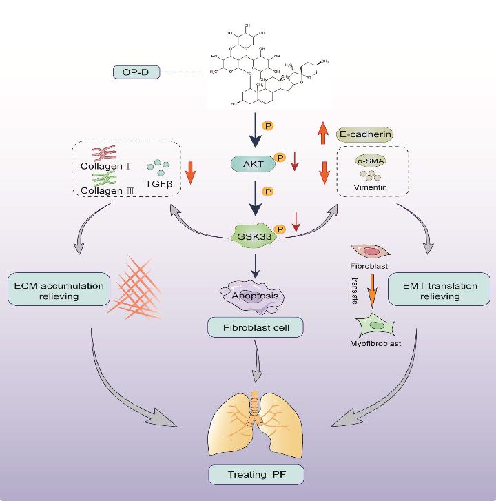 该研究聚焦临床难治性疾病特发性纤维化,通过对临床常用药物的筛选和验证,发现了中药麦冬的单体成分麦冬皂苷-D(Ophiopogonin D,OP-D)具有抗肺纤维化的作用,通过体内体外实验研究,证实OP-D减轻了肺部EMT转化和ECM过度沉积,阻断了肺成纤维细胞向肌成纤维细胞的分化;利用多组学技术整合研究发现,OP-D治疗肺纤维化的作用机制是通过PI3K/AKT/GSK3β信号途径抑制成纤维细胞的增殖和分化,并且联合使用PI3K抑制剂和OP-D可以大幅减轻肺纤维化病理进展。研究结果表明麦冬皂苷-D是一种潜在的治疗肺部炎症与纤维化的药物,这为肺纤维化治疗措施新型抗纤维化药物的开发提供了新的策略。