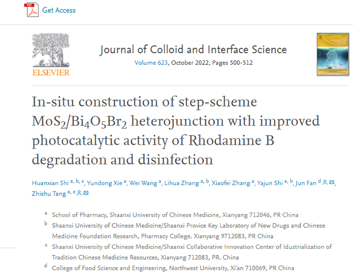 近日,我校药学院青年教师施欢贤博士在化学领域Top期刊《Journal of Colloid and Interface Science》(IF: 8.128, JCR一区)发表了题为“In-situ construction of Step-scheme MoS2/Bi4O5Br2 heterojunction with improved photocatalytic activity of Rhodamine B degradation and disinfection”的研究论文,文章链接:https://doi.org/10.1016/j.jcis.2022.04.148。