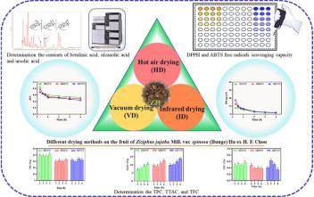 酸枣果肉是中药酸枣仁加工过程中产生的一种具有高利用价值的副产物,但酸枣果肉含水量较高、易发霉变质,严重影响其高效利用。本研究采用不同干燥技术(热风干燥、红外干燥、真空干燥)对酸枣果肉进行干燥加工处理,探究了不同干燥技术对酸枣果肉干燥动力学、水分、活性成分及抗氧化生物活性的影响。结果表明,红外干燥技术具有干燥速度快、成分损失低的技术优势,并为其它中药干燥加工技术的优化选择提供了参考借鉴。