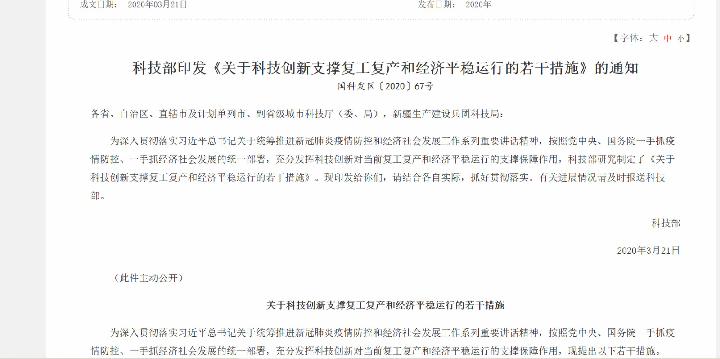 科技部《关于科技创新支撑复工复产和经济平稳运行的若干措施》